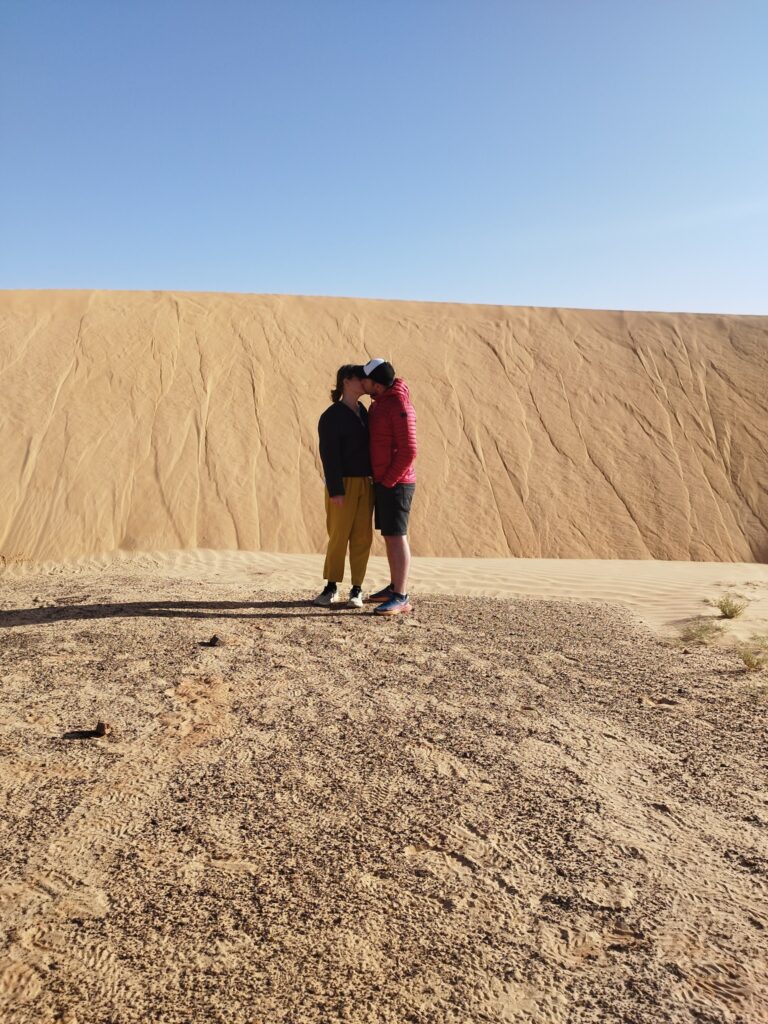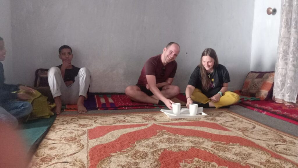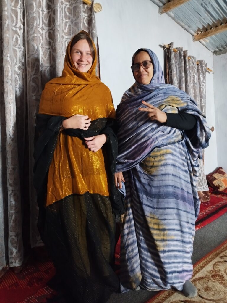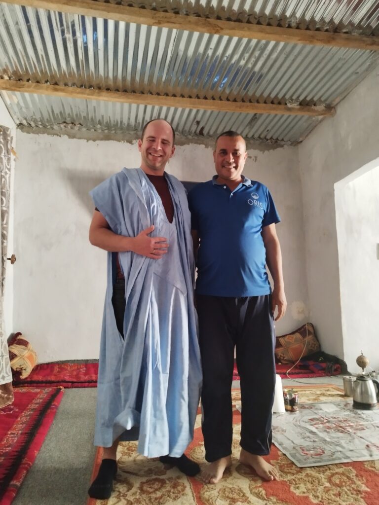 Első napunkon például a homokdűnék között, szélviharban vezetve bementünk egy kis faluba – ritkán találhatóak települések errefelé –, hogy kávézzunk egyet. A faluban nagyon meglepődtek és megörültek az érkezésünknek, végül találtunk egy bácsit, akivel a pár szó franciánkkal meg tudtuk beszélni, hogy kávét szeretnénk, aki elmondta, hogy ebben a faluban nincsen kávézó, Nescafét vehetünk csak a kisboltban. Mint kiderült, ez teljesen jellemző Mauritániára, a nagyobb településeken szenegáliak árulják a café toubát. Ahogy mentünk kifelé a faluból, egy nő integetett, hogy kövessük. Beinvitált a házába, és főzött nekünk kávét. Próbáltunk mutogatva, a nagyon kevés franciánkkal, valamint a kevés angollal, amit a fia, Mohamed tudott, beszélgetni, és egészen belejöttünk egy idő után. Fél óra múlva hazaérkezett a férje és a másik fia is, és megmutatták képeken, hogy milyen szép oázis található a faluban, ahol isteni finom datolya terem, amit mi is megkostólhattunk. Annyira összebarátkoztunk a nyelvi akadályok ellenére, hogy hoztak nekünk tradicionális mauritániai ruhákat, amiket megmutattak, hogyan kell viselni, és végül ajándékba nekünk is adták, azt is felajánlották, hogy maradjunk ebédre, és aludjunk náluk, de ezt már nem fogadtuk el. Nagyon megtelt a szívünk szeretettel a sok kedvességtől, amit kaptunk ettől a családtól.