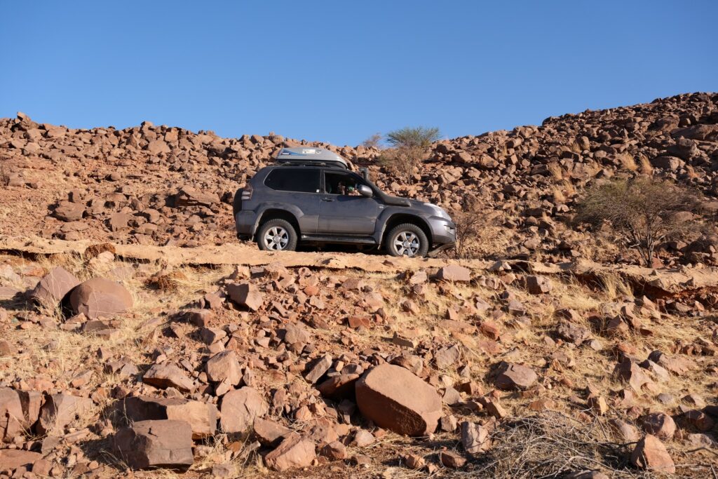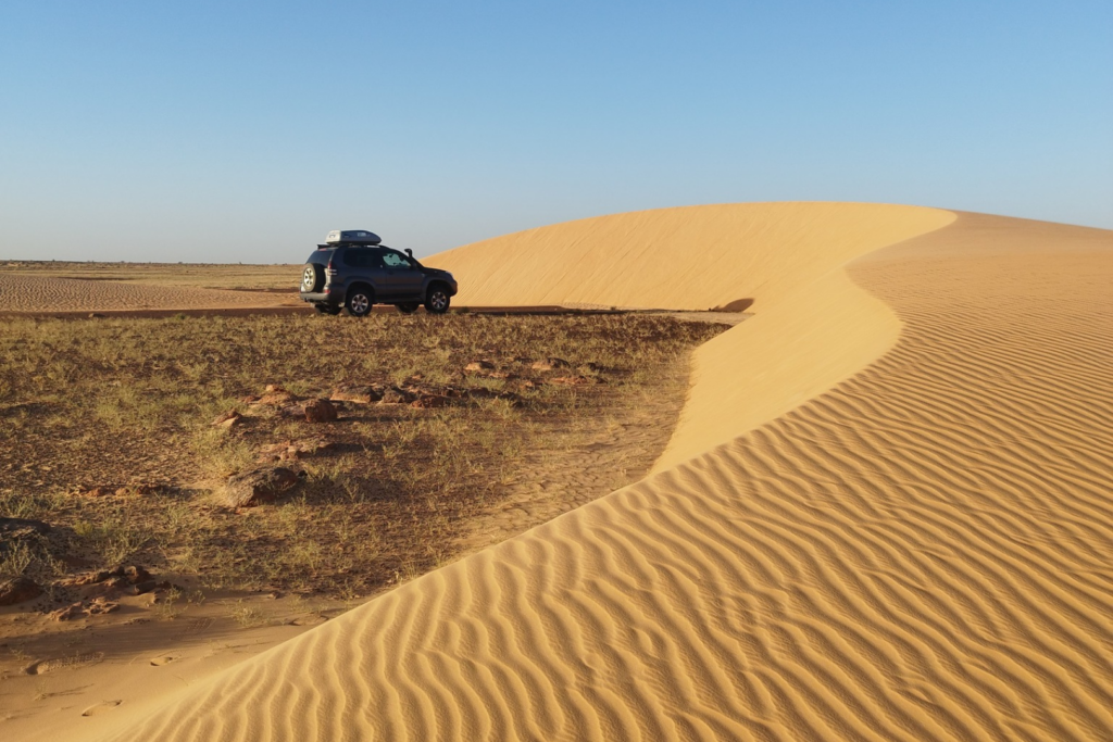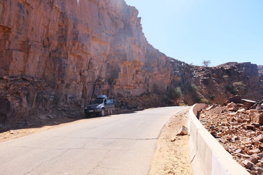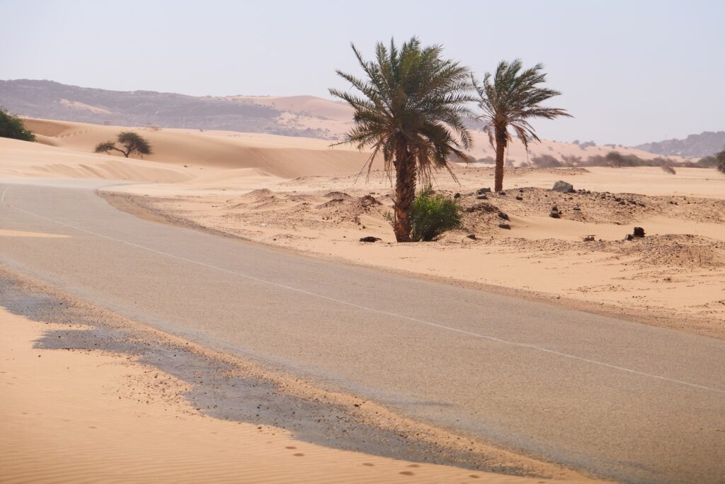 Hallottuk hogy van egy Tidjikjába vezető út, amelyet pár éve leaszfaltoztak, viszont még egyáltalán nincs fenn a Google Maps-en. Körbekérdeztünk, és mindenki ajánlotta az utat, mivel gyönyörű tájakon vezet át. Az egyetlen kockázatot az jelentette, hogy a dűnék időnként beterítik az utat, és ilyenkor ki kell ásni magunkat. Az út valóban gyönyörű volt! Annyira kevés autó jár erre, hogy a 300 kilométer alatt összesen kb. 15-tel találkoztunk. Pár óra vezetés után találtunk egy helyet, ahol elég kemény volt a homok ahhoz, hogy sátorhelyet keressünk egy dűne árnyékában. Elértünk Tidjikjába, az első nagyobb településre, amely igazi sivatagi kisváros volt, érdekes piaccal, de egyetlen éttermet sem találtunk. Ezután a tervünk az volt, hogy elvezetünk egy Nbeika nevű településre, ahonnan 25 kilométernyi homokban vezetés után egy folyóvölgybe ér az ember, ahol sivatagi krokodilokat láthat. Elég sokáig vezettünk a homokban, de végül nem sikerült megtalálnunk a krokodilokat (csak rengeteg gyerekkel találkoztunk az út végén, akik a kocsinkra ugráltak, így inkább visszafordultunk). Ennek ellenére elképesztően érdekes helyeket láttunk: homokdűnék között nagyon zöld kerteket, apró településeket és folyókat (amelyekben itt volt víz). Éjszakára találtunk egy vadkemping helyet egy folyó partján, a fák árnyékában.