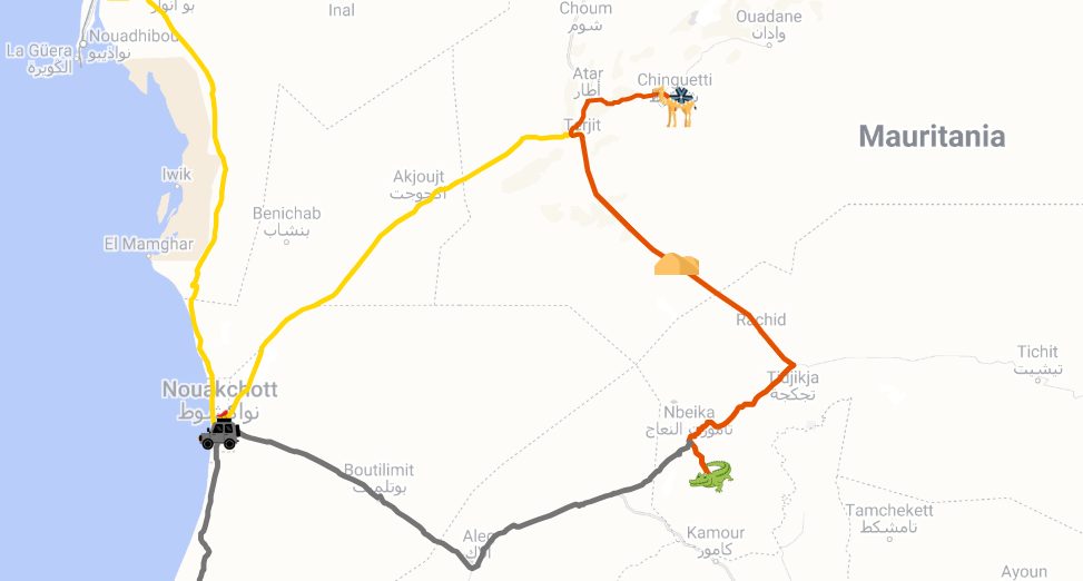 Chinguetti után eredetileg Oudanba terveztünk menni, amely szintén az UNESCO Világörökség része és a karavánutak központjaként szolgált, azonban úgy döntöttünk, hogy mégsem vállaljuk be a még 100 kilométernyi rossz utat (nagyon elkorrugálódott az út). Azonban kicsit bánjuk, hogy végül nem vállaltuk be, Abdou mondta, hogy pár nap alatt a sivatagon keresztül tevével (vagy akár 1 nap alatt terepjáróval) is át lehet érni, ami nagyon jó kaland lehet.