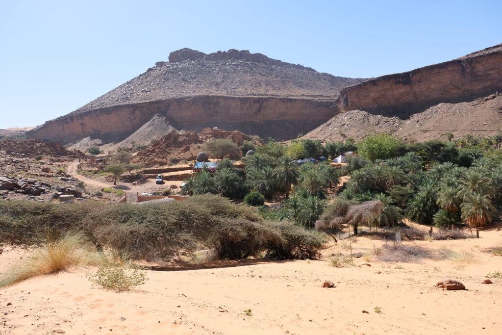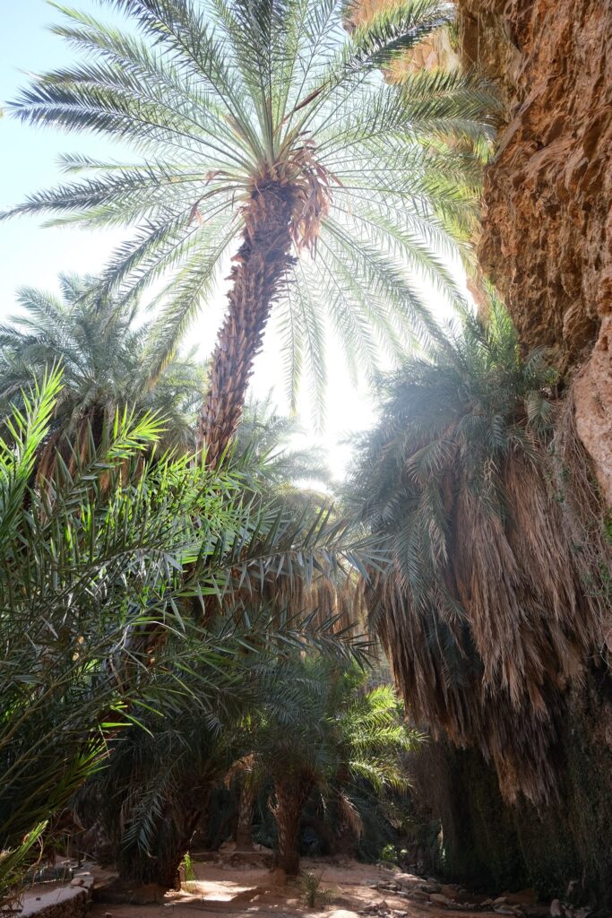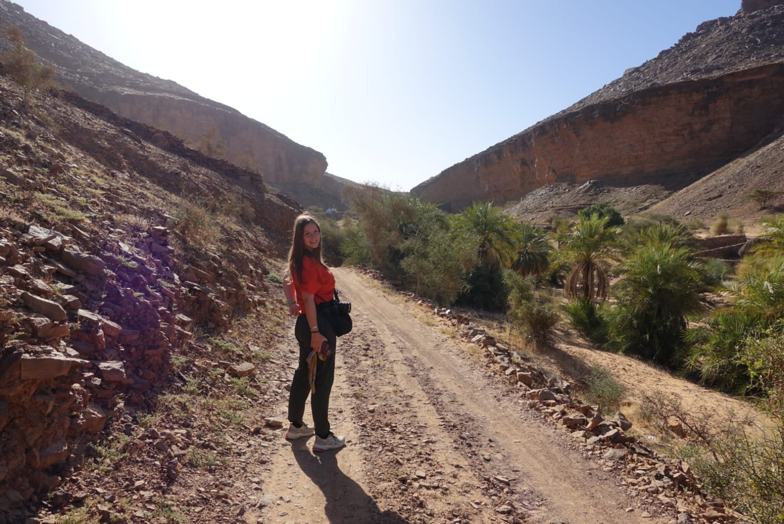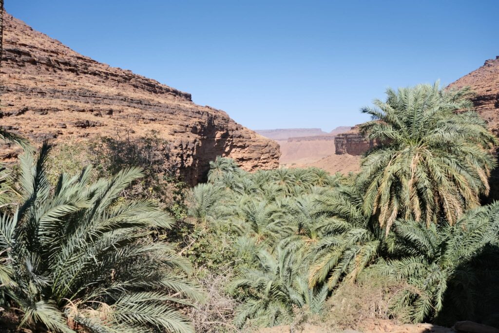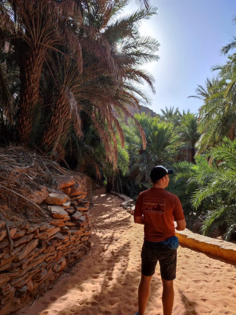 A fővárosból Terjit oázisába vettük az irányt. Pár száz kilométeren keresztül inkább unalmas sivatagi síkságon haladtunk keresztül, amikor egyszer csak a távolban hegyeket pillantottunk meg. A hegyek előtt hatalmas dűnék terültek el, ahogy közeledtünk az oázishoz. Az oázis bejárata egy hatalmas sziklahasadék volt, amin keresztül beértünk a völgybe, ahol teljesen elállt a lélegzetünk. Sziklás hegyek, gyönyörű dűnék és végtelen pálmafák fogadtak minket.