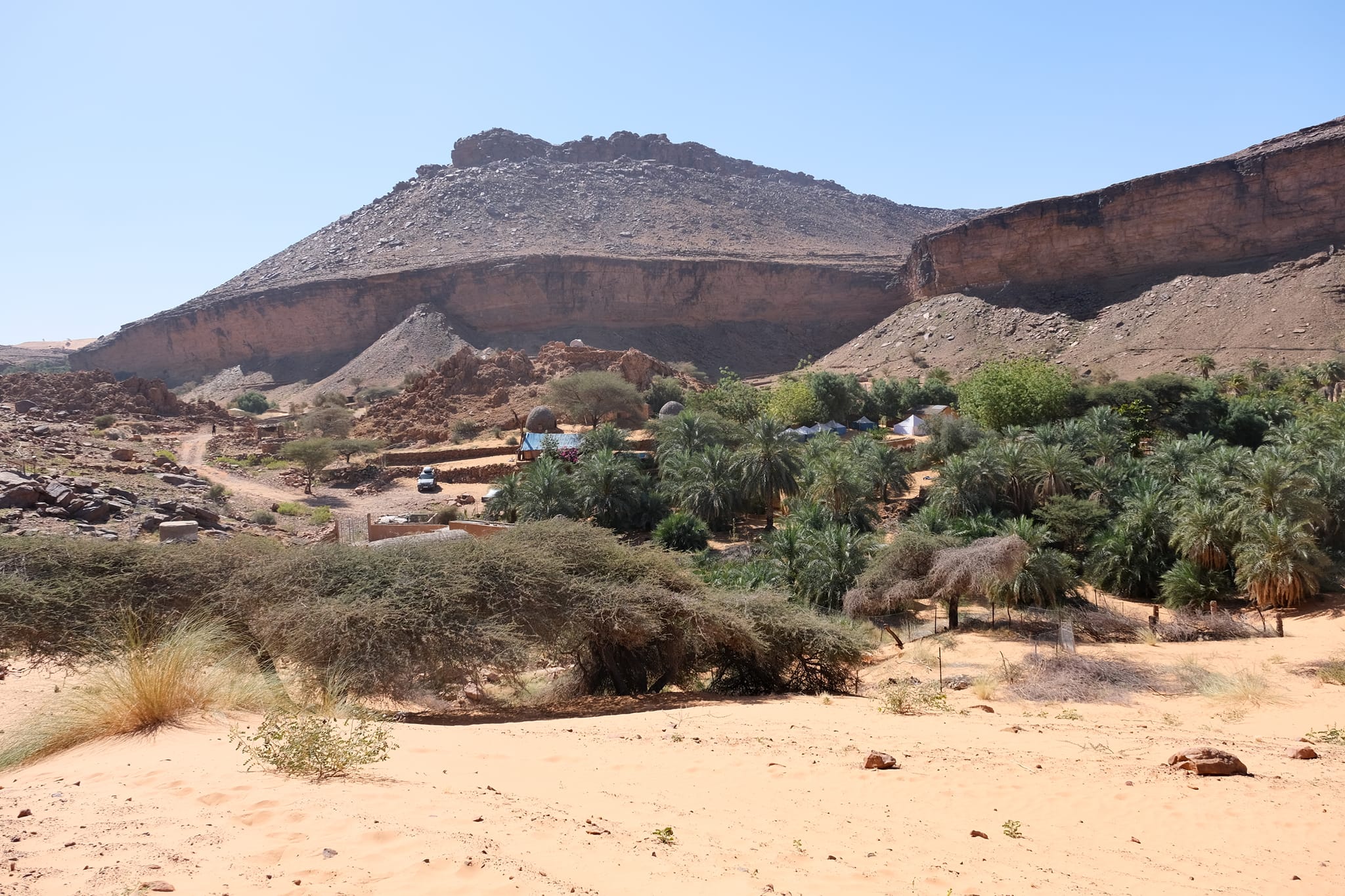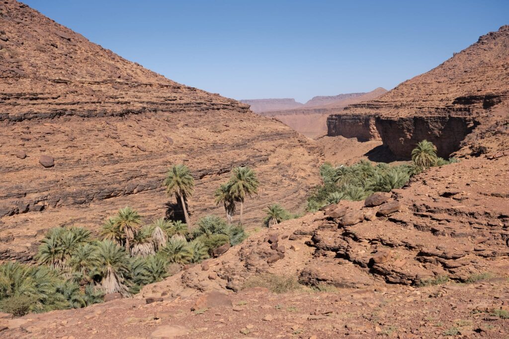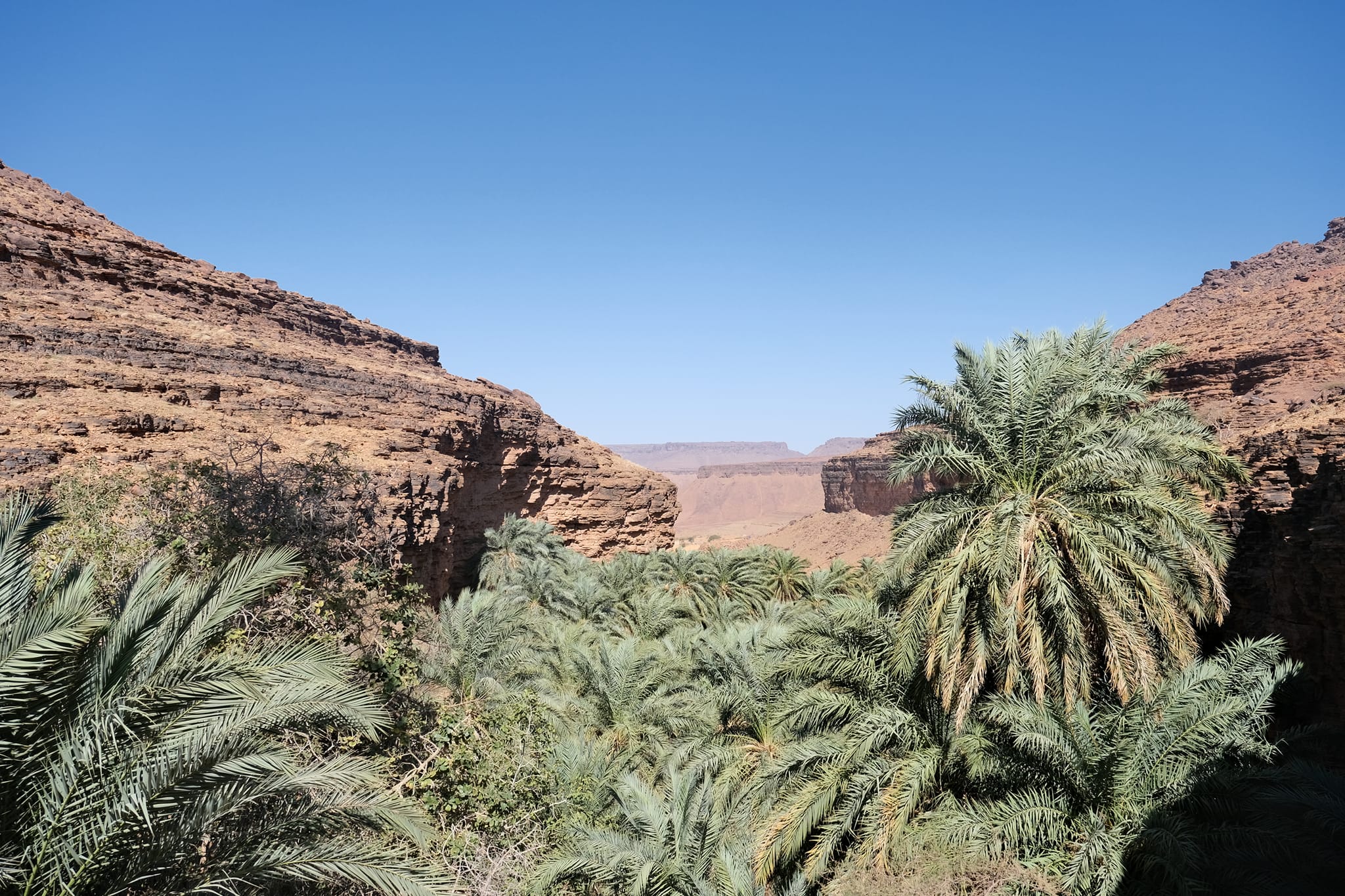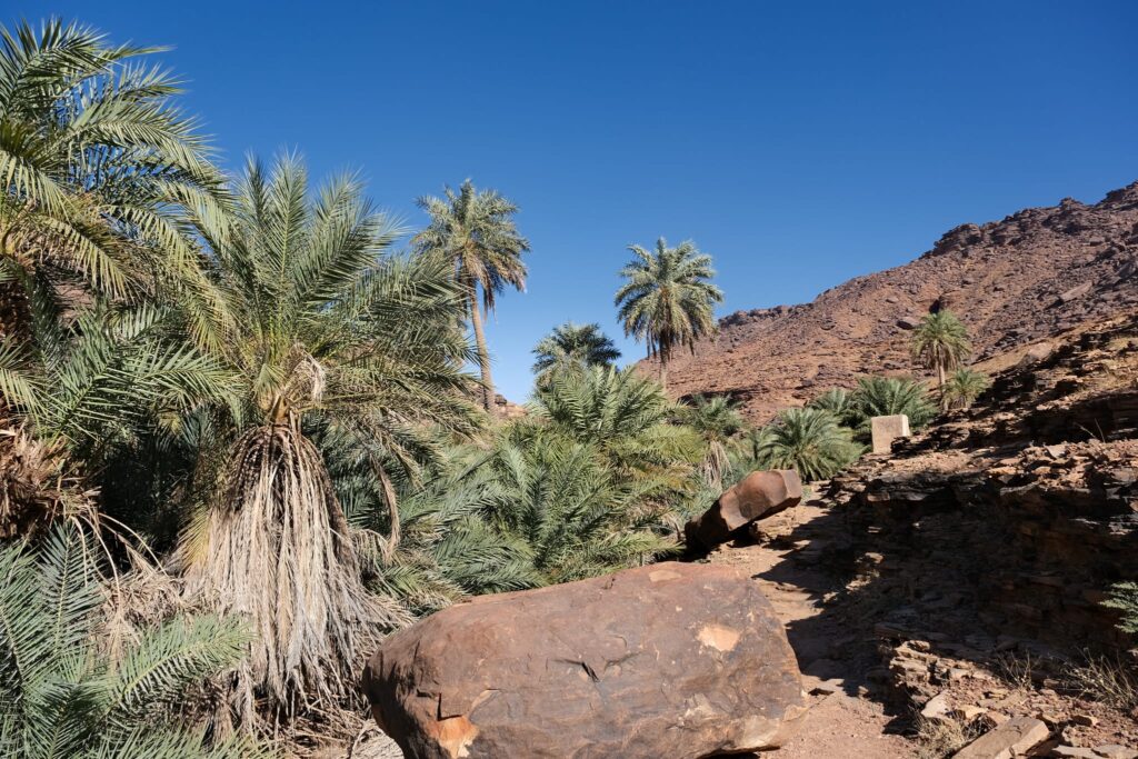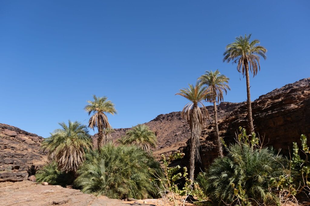 A fővárosból Terjit oázisába vettük az irányt. Pár száz kilométeren keresztül inkább unalmas sivatagi síkságon haladtunk keresztül, amikor egyszer csak a távolban hegyeket pillantottunk meg. A hegyek előtt hatalmas dűnék terültek el, ahogy közeledtünk az oázishoz. Az oázis bejárata egy hatalmas sziklahasadék volt, amin keresztül beértünk a völgybe, ahol teljesen elállt a lélegzetünk. Sziklás hegyek, gyönyörű dűnék és végtelen pálmafák fogadtak minket.