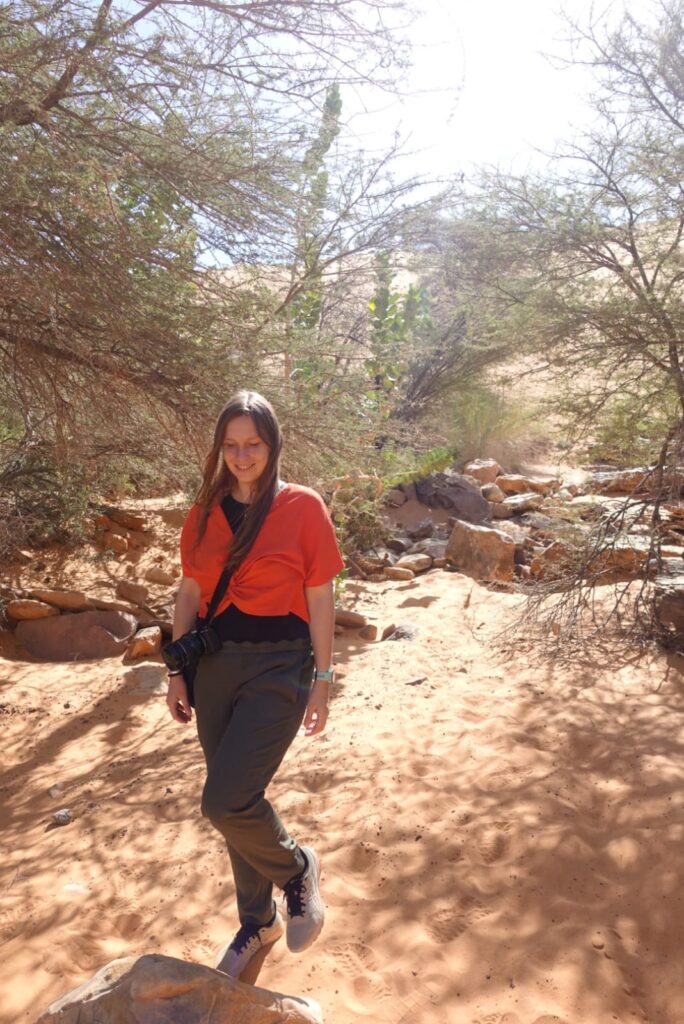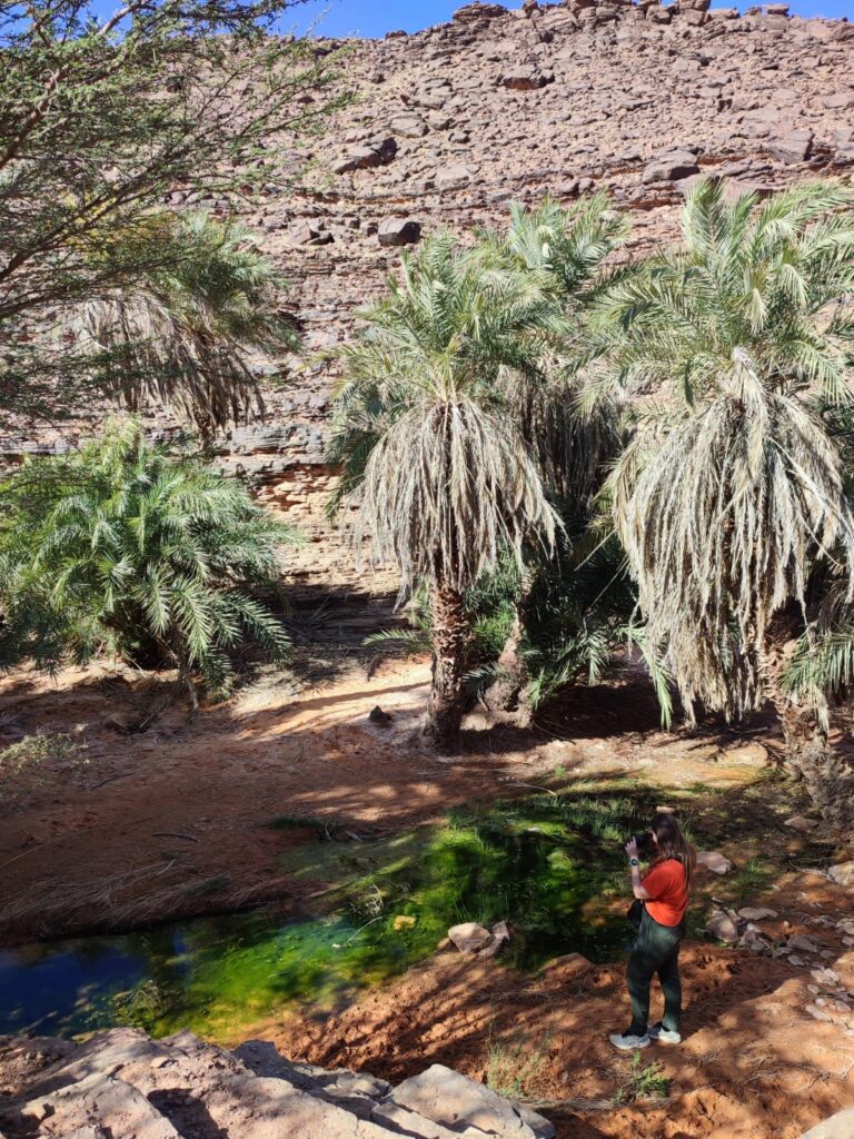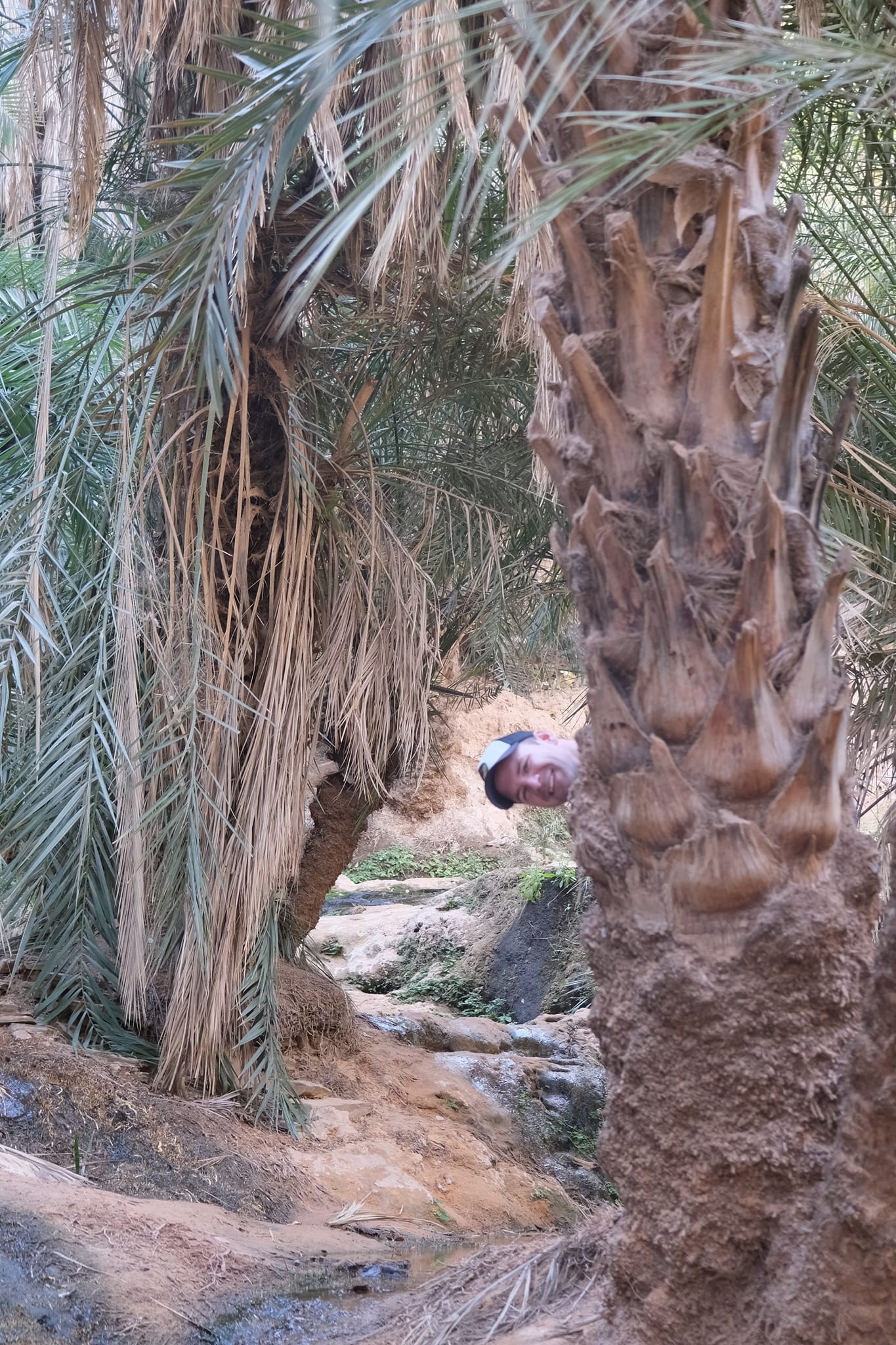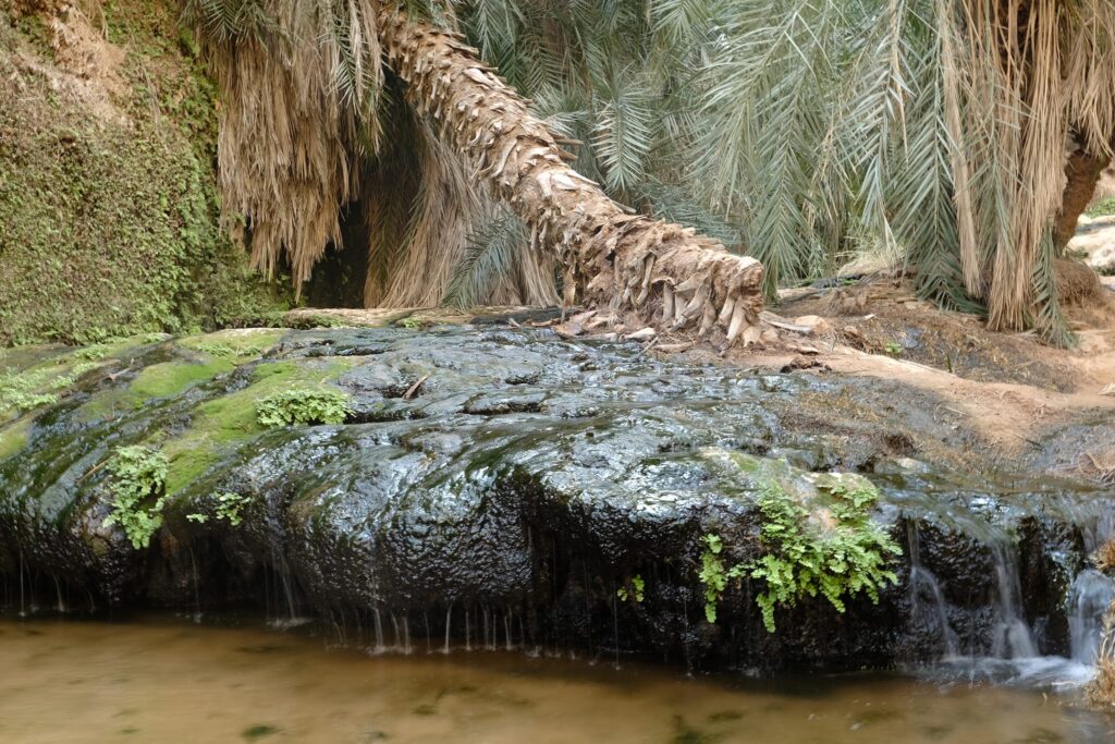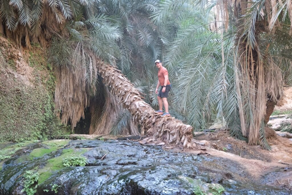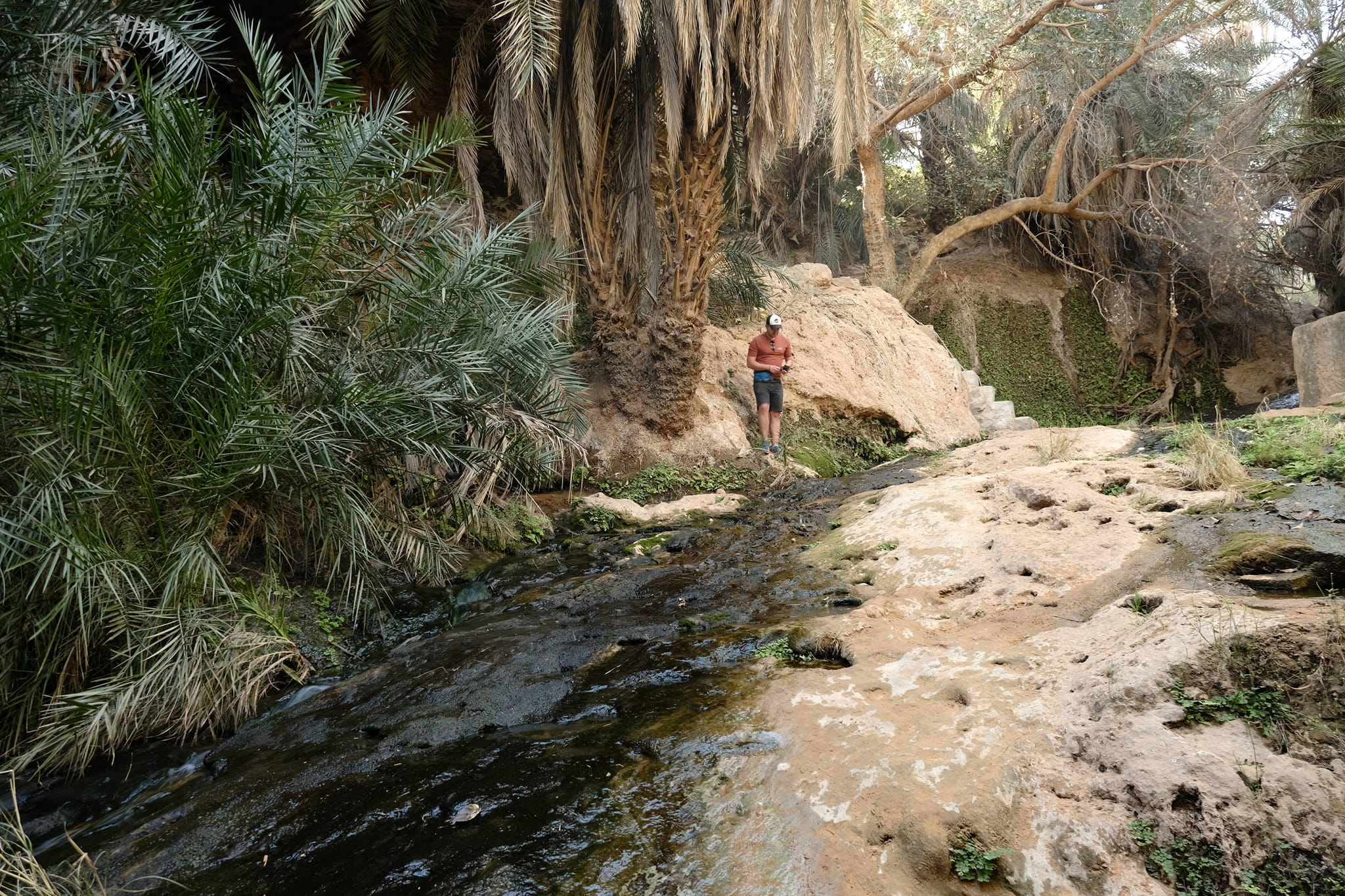 Másnap besétáltunk az oázisba, ahol még több pálmafa és rengeteg zöldes-kékes víz fogadott minket. Az oázis körül ki volt jelölve egy kis ösvény, így túráztunk kicsit a folyó völgyében, átkeltünk a dűnéken és köves dombokon.