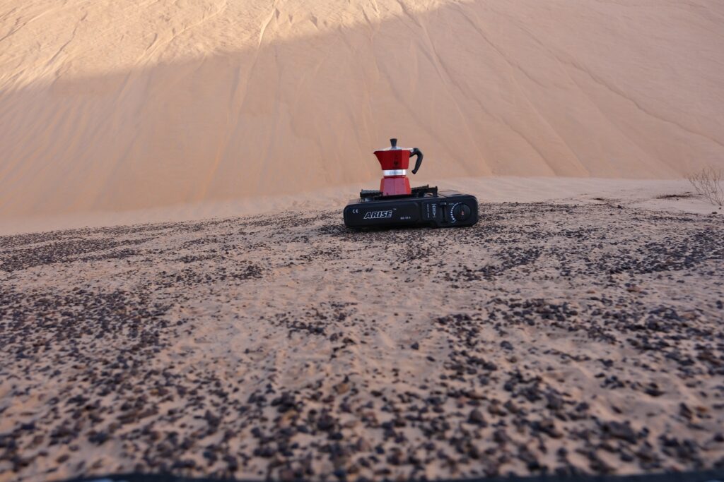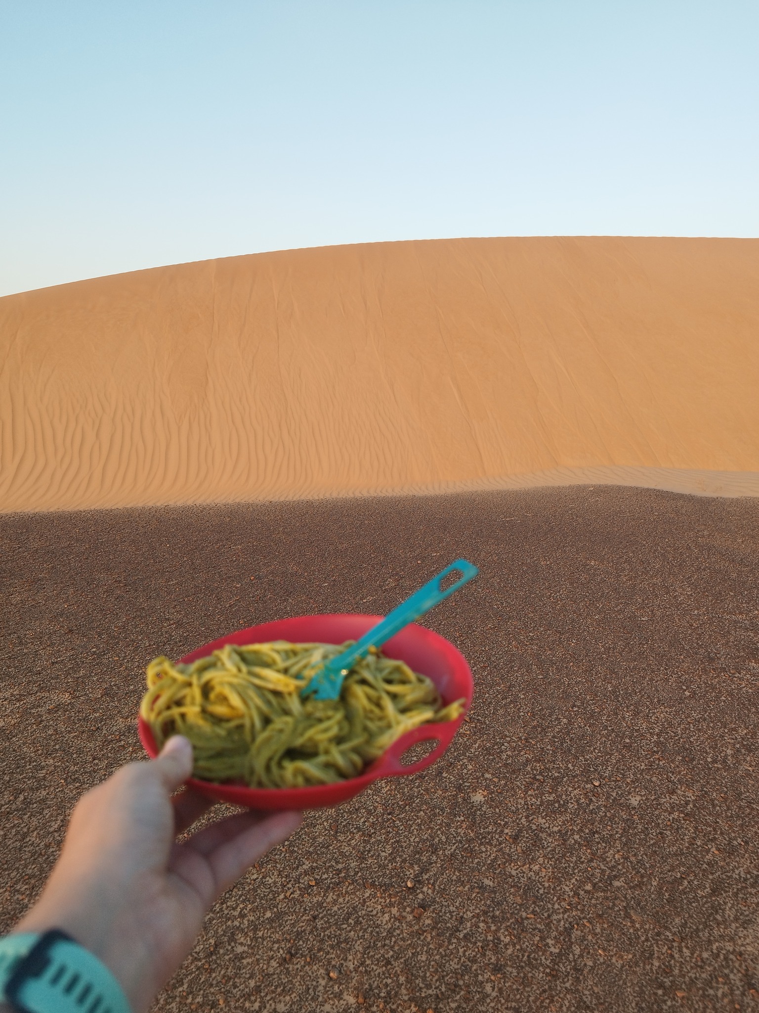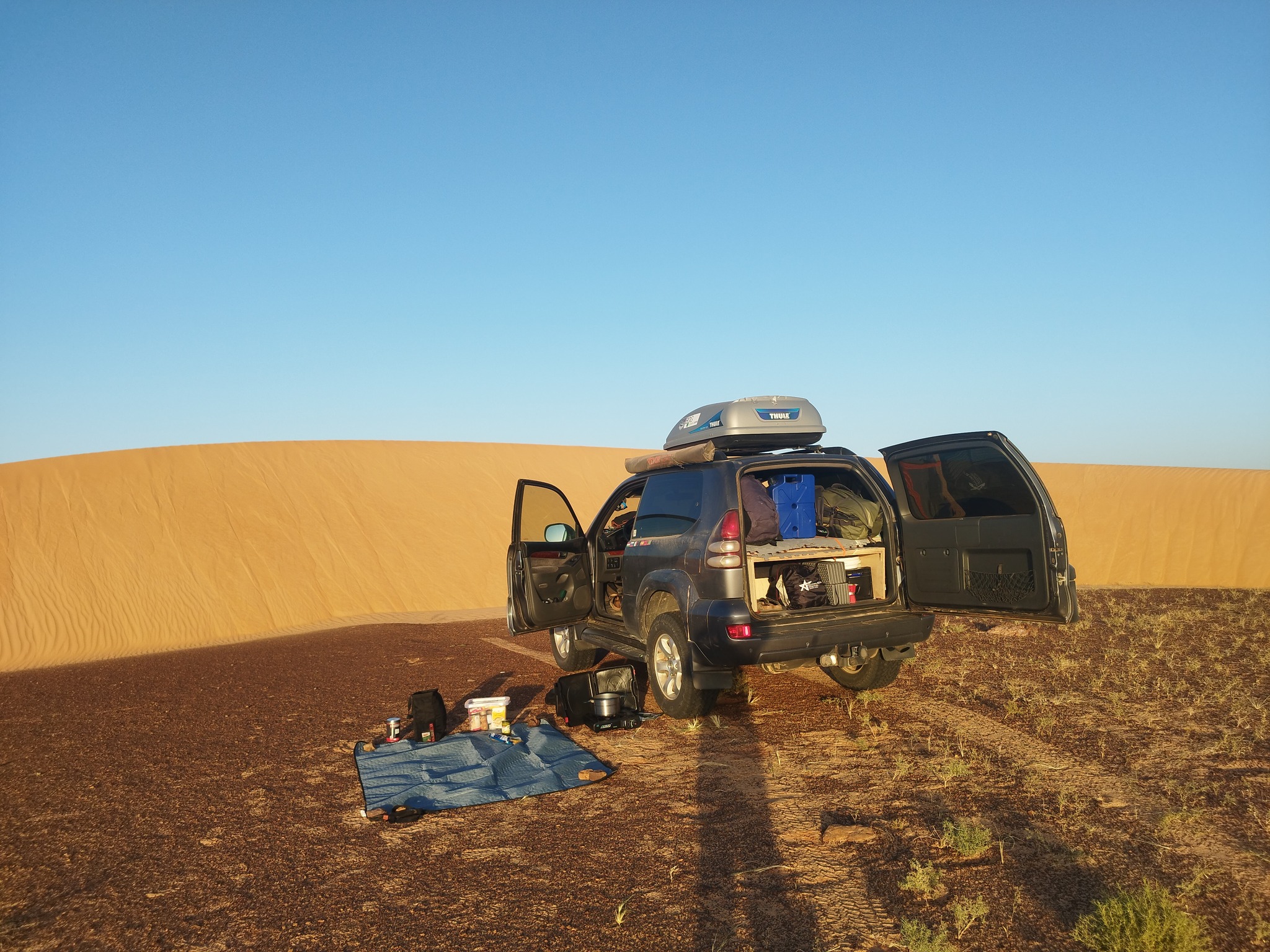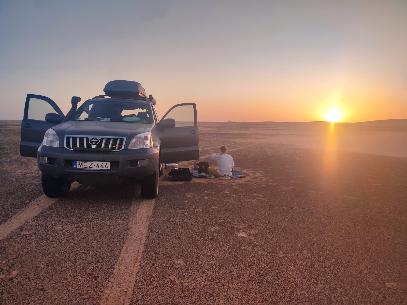 Körbekérdeztünk, és mindenki ajánlotta az utat, mivel gyönyörű tájakon vezet át. Az egyetlen kockázatot az jelentette, hogy a dűnék időnként beterítik az utat, és ilyenkor ki kell ásni magunkat. Visszavezettünk Terjitig, ahonnan az út indult, és elindultunk azzal a tervvel, hogy ott vadkempingezzünk, ahol az éjszaka ér minket.