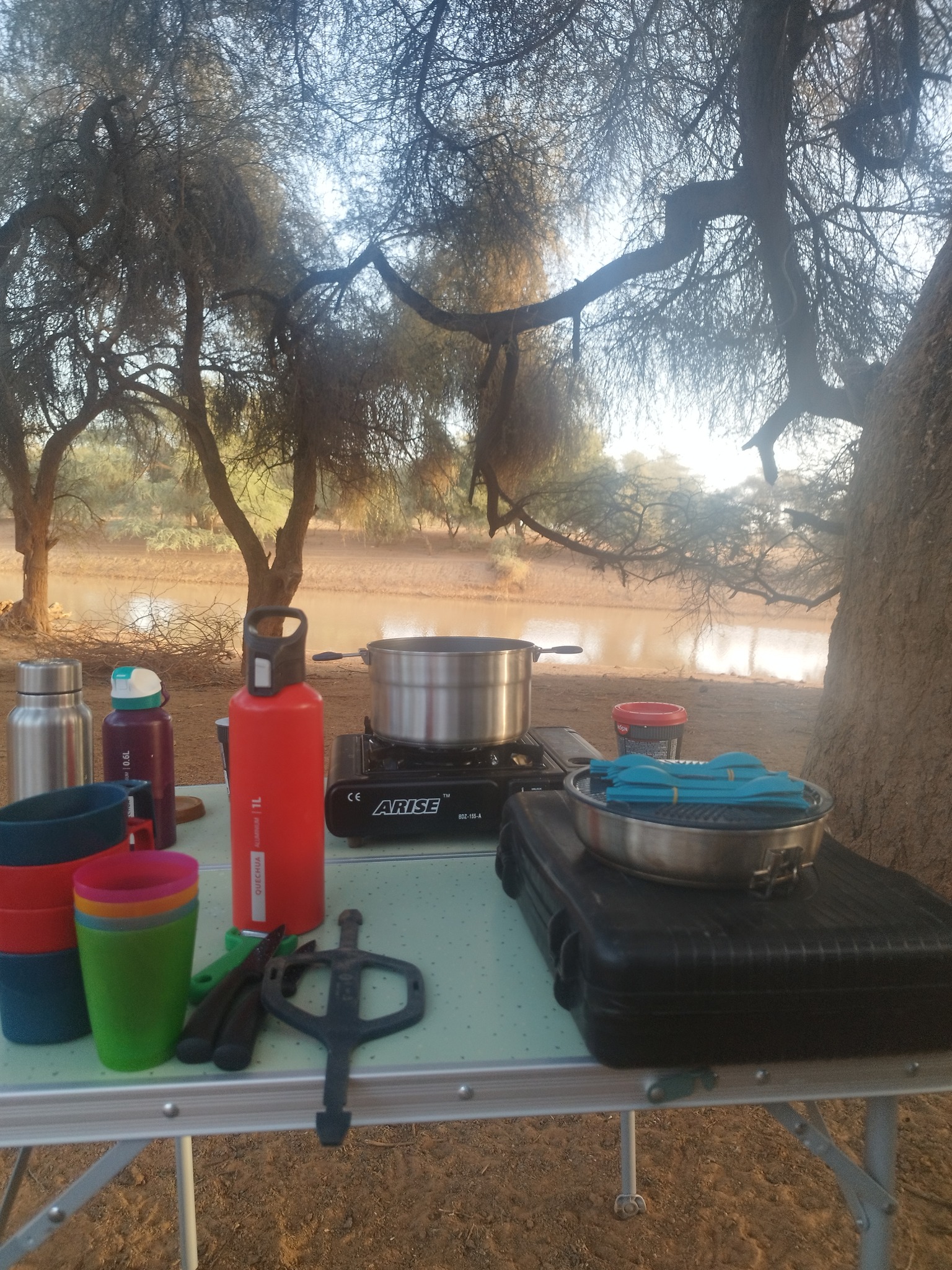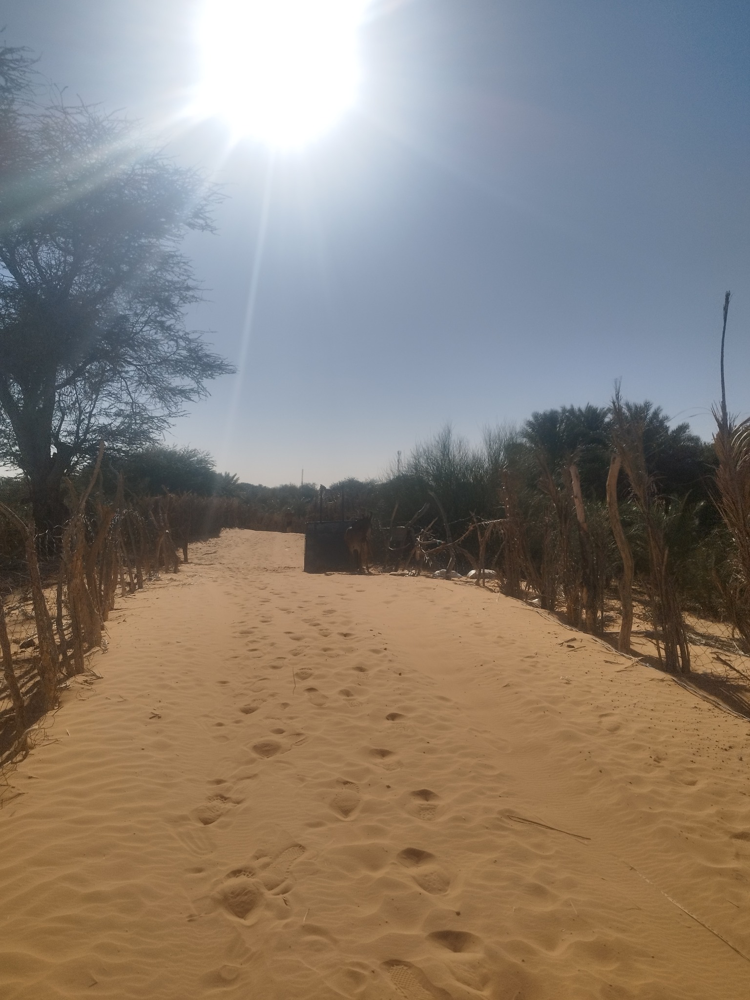 Elértünk Tidjikjába, az első nagyobb településre, amely igazi sivatagi kisváros volt, érdekes piaccal. A tervünk az volt, hogy elvezetünk egy Nbeika nevű településre, ahonnan 25 kilométernyi homokban vezetés után egy folyóvölgybe ér az ember, ahol sivatagi krokodilokat láthat. Elég sokáig vezettünk a homokban, de végül nem sikerült megtalálnunk a krokodilokat. Ennek ellenére elképesztően érdekes helyeket láttunk: homokdűnék között nagyon zöld kerteket, apró településeket és folyókat (amelyekben itt volt is víz). Éjszakára találtunk egy vadkemping helyet egy folyó partján, a fák árnyékában.