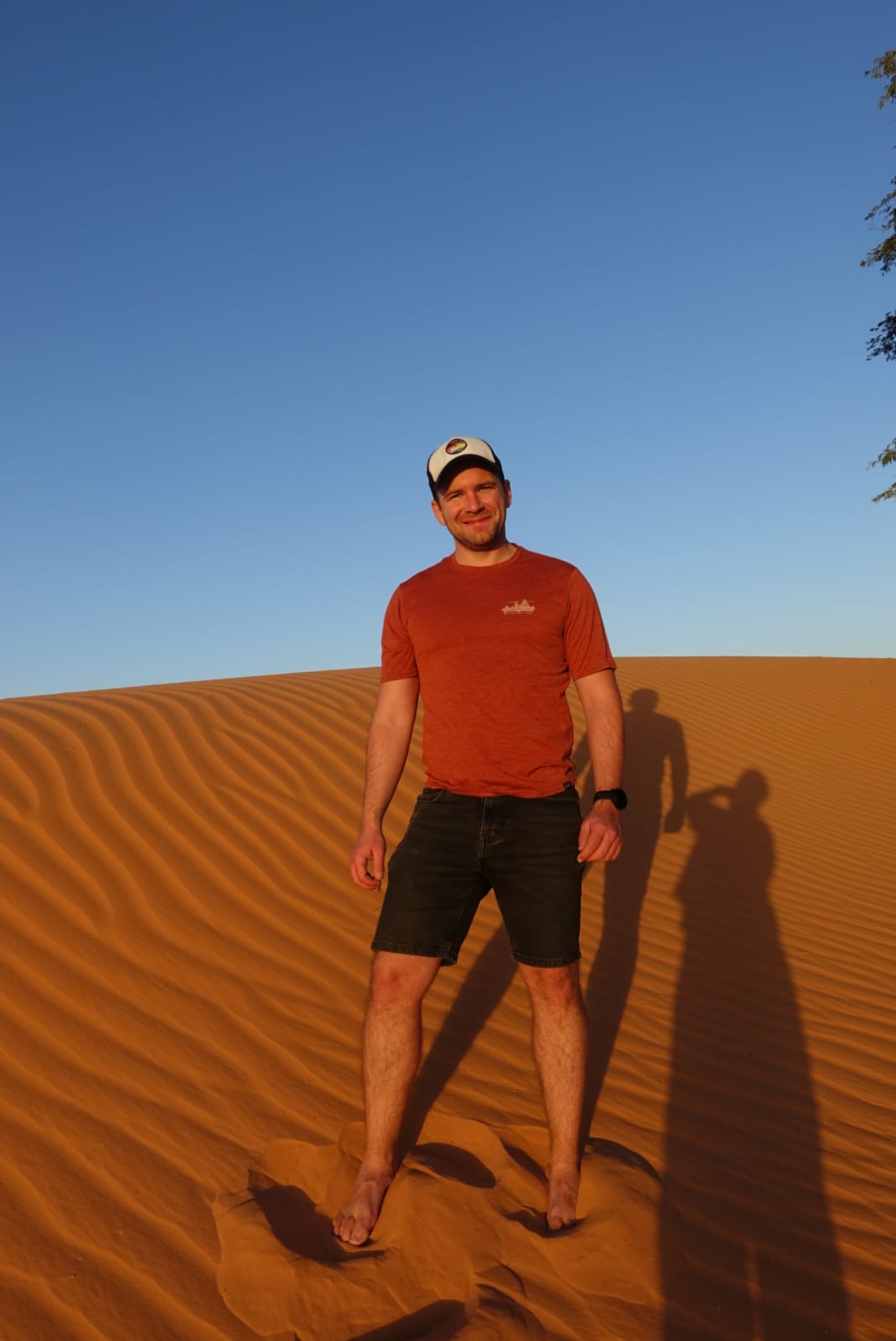 Az út valóban gyönyörű volt! Pár óra vezetés után találtunk egy helyet, ahol elég kemény volt a homok ahhoz, hogy sátorhelyet keressünk egy dűne árnyékában. Nem voltunk messze az úttól, de annyira kevés autó jár erre, hogy a 300 kilométer alatt összesen kb. 15-tel találkoztunk.
