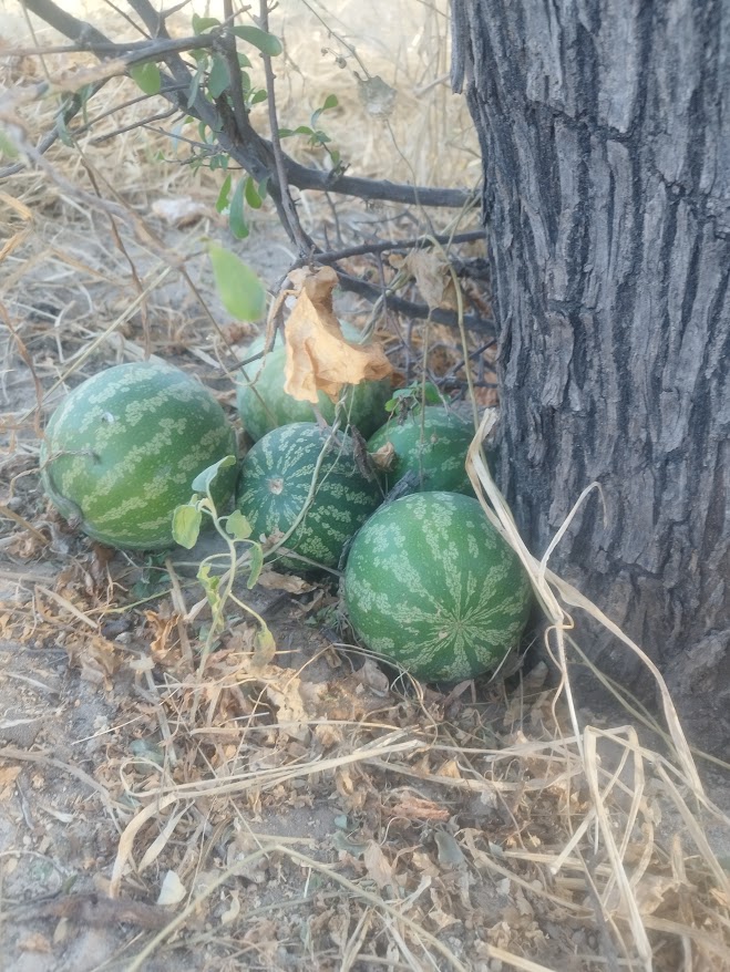 Kicsit izgultunk, hiszen az Etosha kiépítettsége után ez ismeretlen terep volt számunkra. Egyből nagyon mély homokon keresztül 3 óra alatt kellett eljutnunk Xade-ig, a nemzeti park bejáratáig, ahol a szúrós, tövises bokrok végigkarcolták Mezit. Ezeken a bokrokon kívül mindenhol csak görögdinnyére emlékeztető növények voltak, amelyek valamilyen tökfélék lehettek – mindenesetre nagyon érdekes látványt nyújtottak.