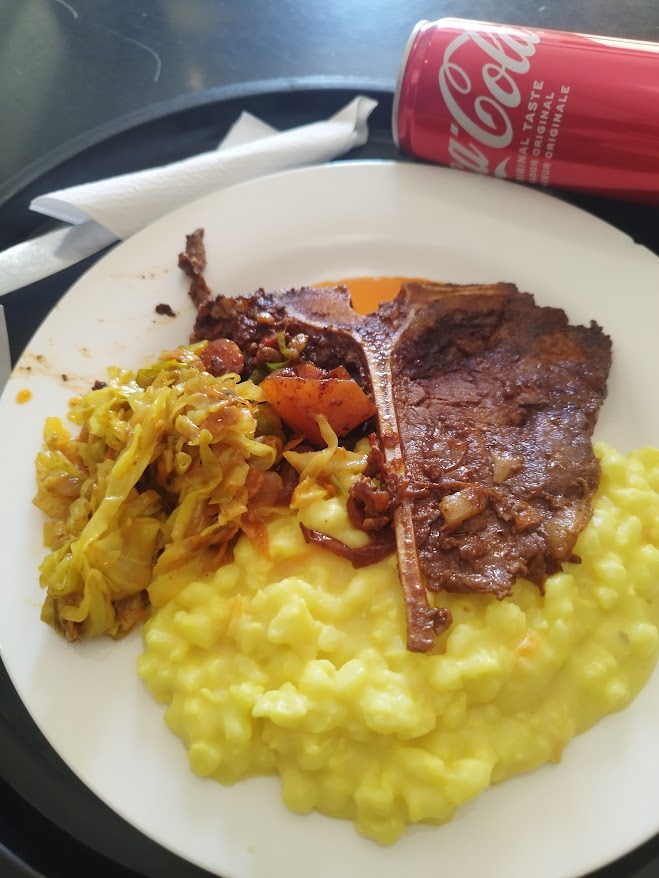 A parkból kiérve nagy szerencsénk volt: láttunk gepárdokat átfutni előttünk, majd ahogy kikanyarodtunk az aszfaltútra, elefántok is átmentek előttünk. Rakopsban megálltunk ebédelni; egy kifőzdében vékonyra szelt T-bone-t ettünk samp-pal (hagyományos dél-afrikai étel, szárított, őrölt kukoricamagból készült), és tépett marhahúst – mindkettő nagyon finom volt.