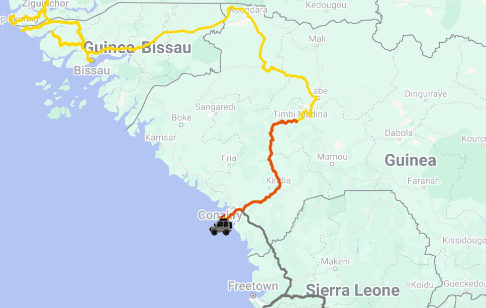 Csütörtökön jött a hír, hogy megkaphatjuk a DRC-vízumot, ha előbb elmegyünk a Kongói Köztársaság vízumáért is. Ezt szerettük volna elkerülni, mert itt majdnem tízszer annyiba került, mint Kamerunban, de nem volt más választásunk, mivel beszámolók alapján DRC-vízumot csak Conakryban lehetett kapni. A városba bevezetés és visszavezetés egy egész napot vett igénybe. A DRC-vízumunk ügyintézője azonban felajánlotta, hogy mivel közel lakik hozzánk, így este találkozhatunk a negyedünkbe, és másnap beviszi az útleveleinket, így nekünk már csak azért kellett bemenni a városba mégegyszer, hogy felvegyük a kész vízumot. Péntek kora délután végre elindultunk következő állomásunkra, Sierra Leonéba.
