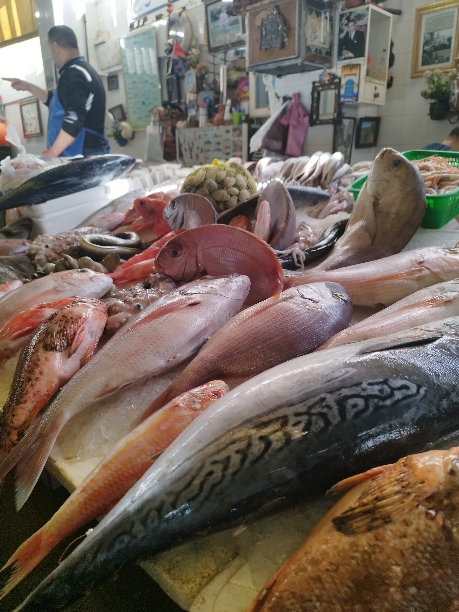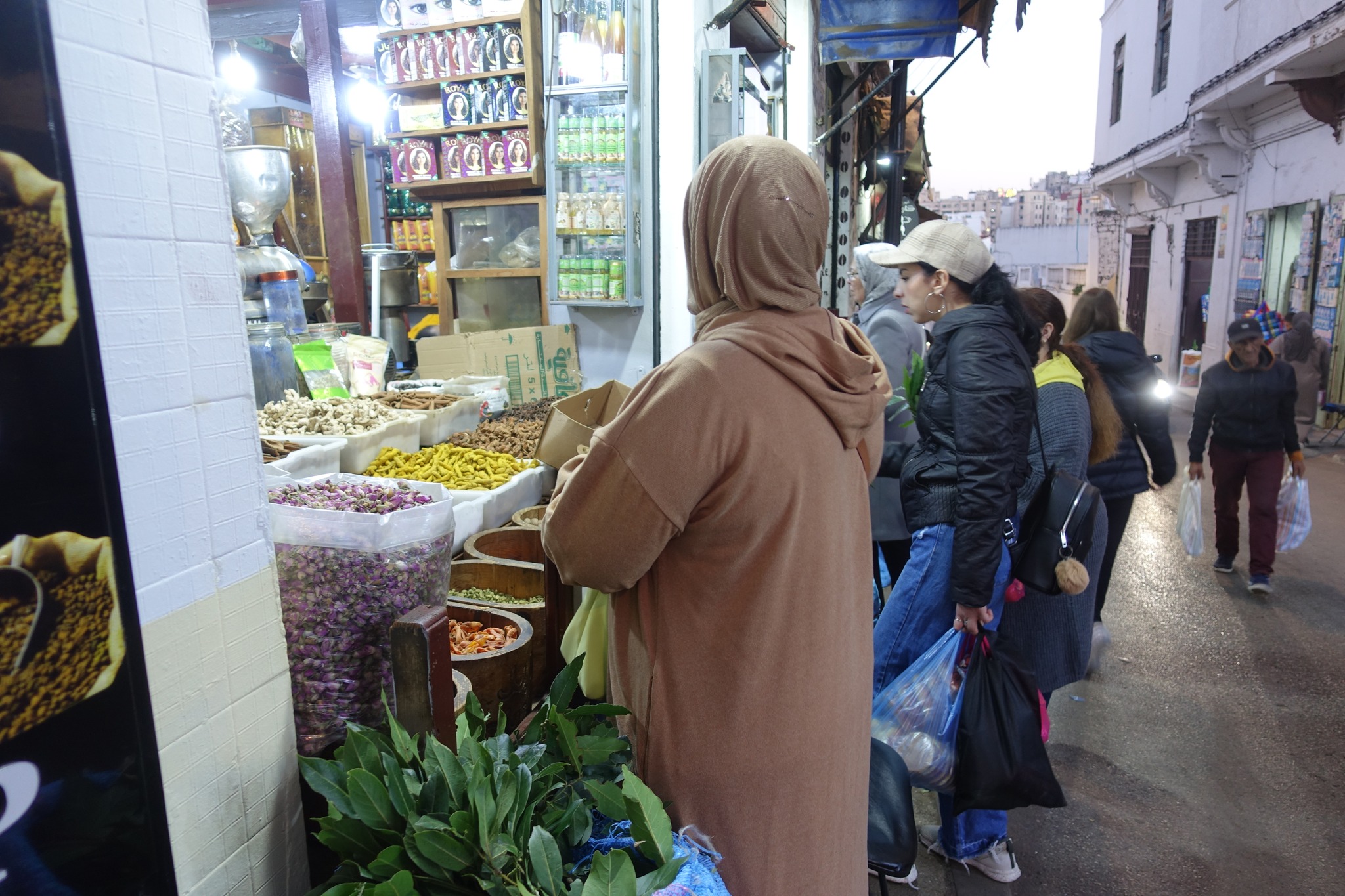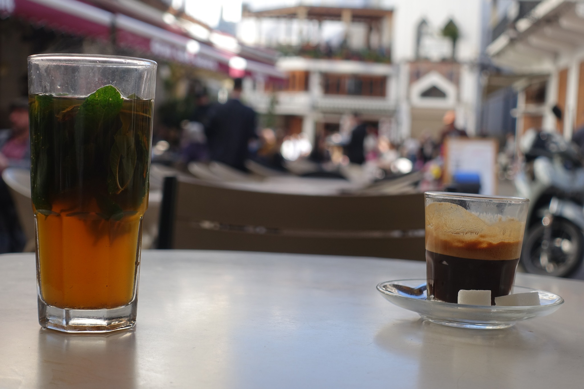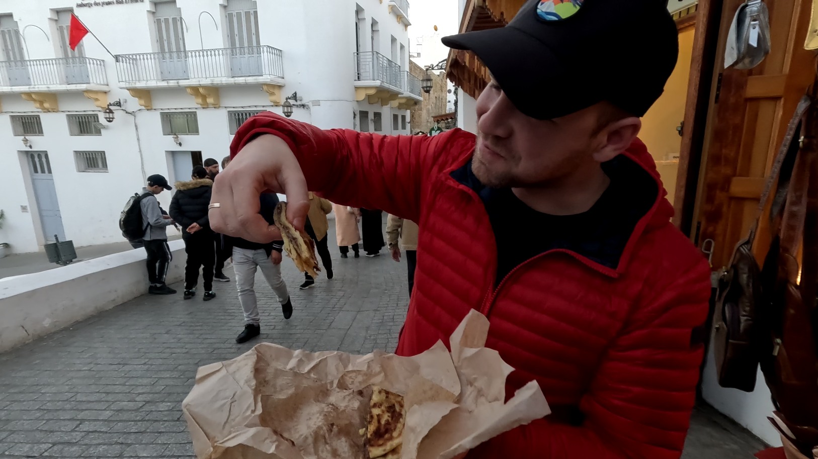 Ami nagy meglepetés volt számunkra, hogy mennyivel később kezdődik az élet. A reggel 8-as futáskor még alig jött fel a nap, és csak pár ember sétált az utcán. A kedvenc halpiacunkon is csak 11 körül kezdtek kipakolni, 1-kor élte a csúcsforgalmát. Mindenki inkább délután/este kezd kijönni, akkor telnek fel a kávézók, ahol mindenki menta teát vagy kávét szürcsöl. Az ételek finomak, de a mi ízlésünknek kicsit kevésbé fűszeresek (bár sok helyen van kitéve plusz chili szósz). Tangierben csirkés tajine-t (cserépedényben zöldségekkel készült) és egy tál babot velős csonttal (ez nagyon finom volt) ettünk ebédre, vacsira pedig leültünk egy utcai helyre, ahol faszenen grillezett csirkét ettünk olivával. Ádám egy népszerű helyi nutellás palacsintát is talált.