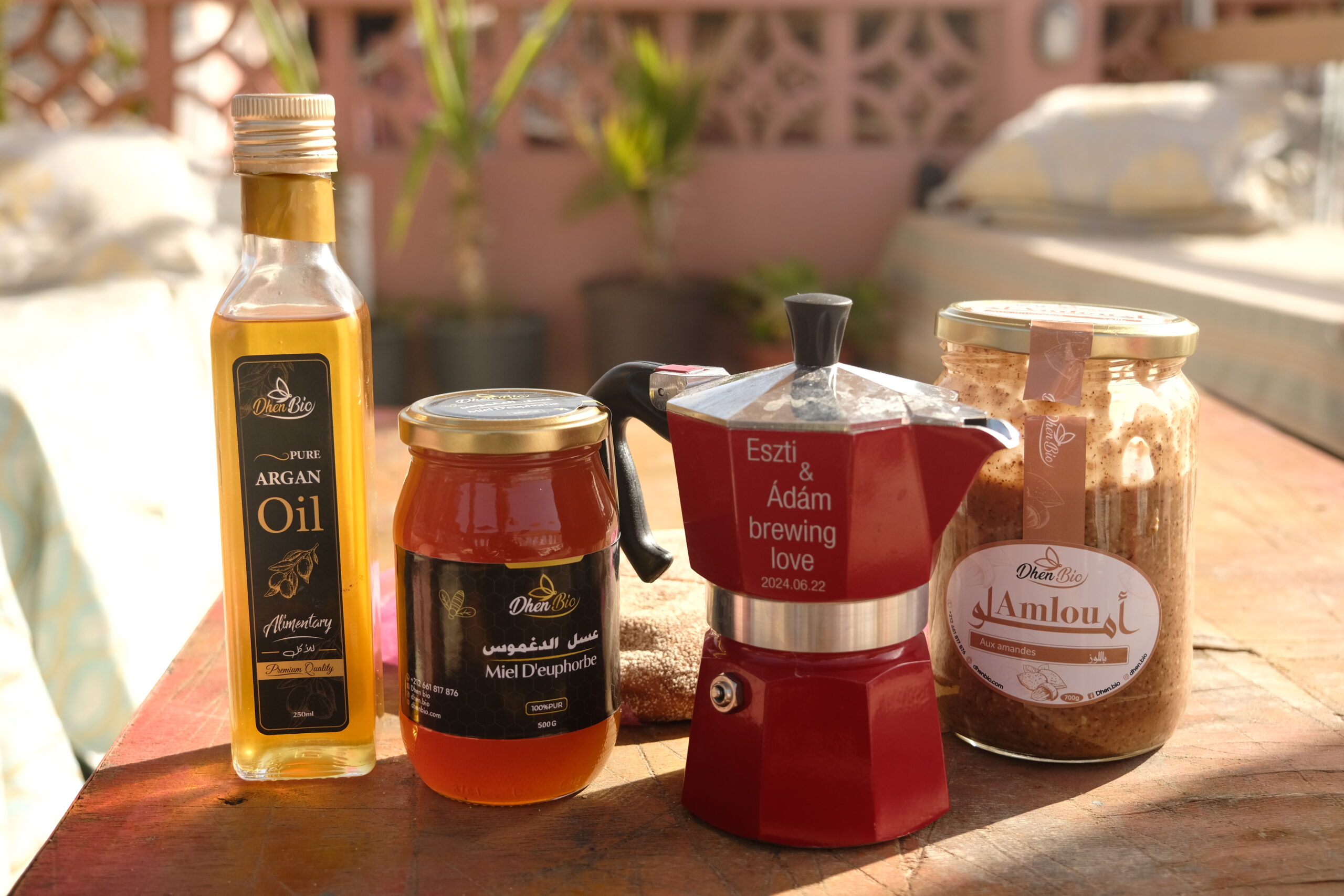 Kaptunk argánolajat, amit ételekhez és kozmetikumként is lehet használni. Az argánolaj a Marokkóban őshonos argánfából készül, és reggelire kenyérbe mártogatva, valamint főzőolajként és ételek ízesítésére is fogyasztják. Ezen kívül kaptunk mézet és amlou-t, ami argánolajból, mézből és mandulából készül – ezt “amazigh Nutellának” is hívják, és reggelire isteni finom (nálunk aggasztóan gyorsan elfogyott egy 7 decis üvegnyi).