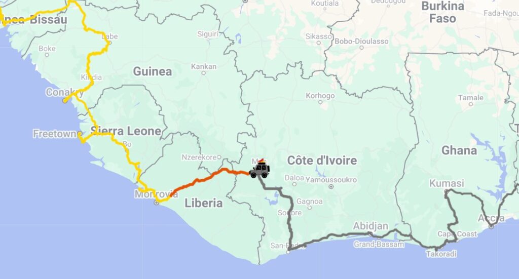 March 8–9.: After an early wake-up, we left Kataka heading toward the Ivorian (Côte d’Ivoire) border. The road to the border was beautiful: we passed through jungle and small villages. Once again, we arrived at a small border crossing, where we were practically the only ones crossing at the time. The border guards were extremely friendly and even tried to speed up the little bit of administration required. While Eszti handled the immigration papers, Ádám was able to go and sort out the car’s exit process.