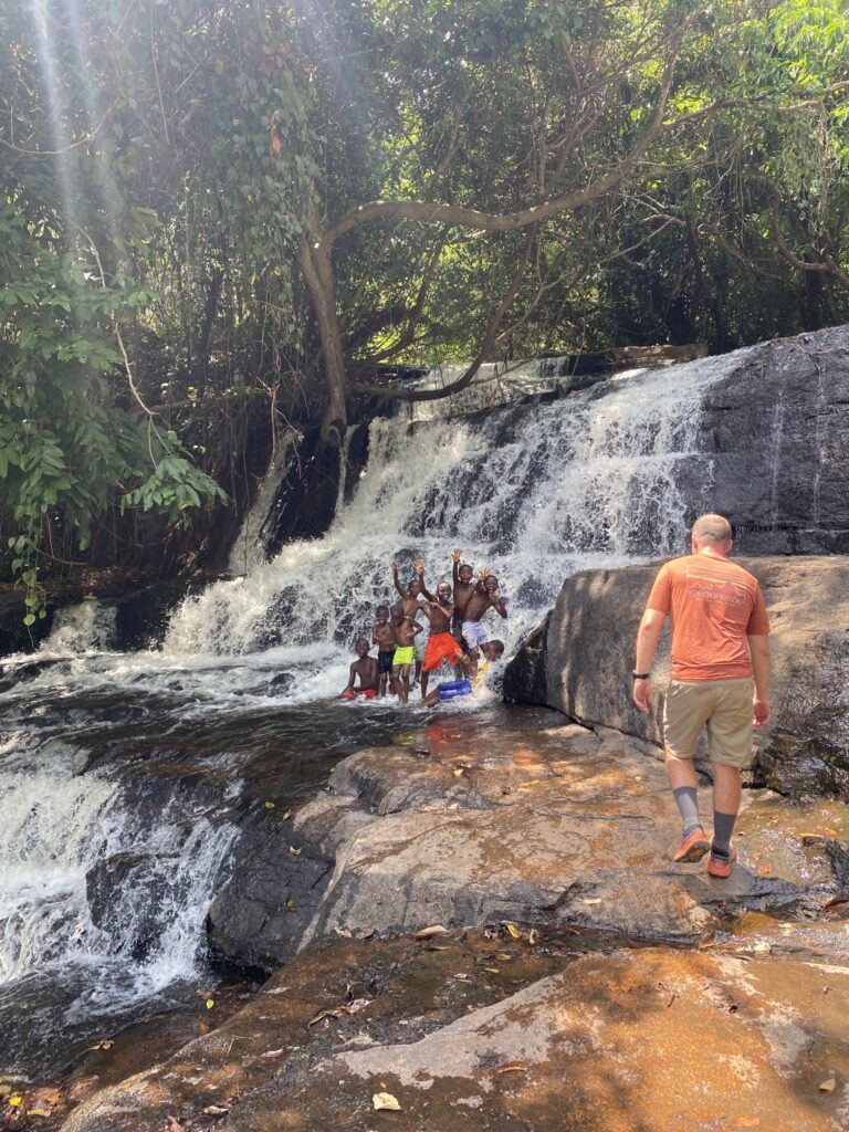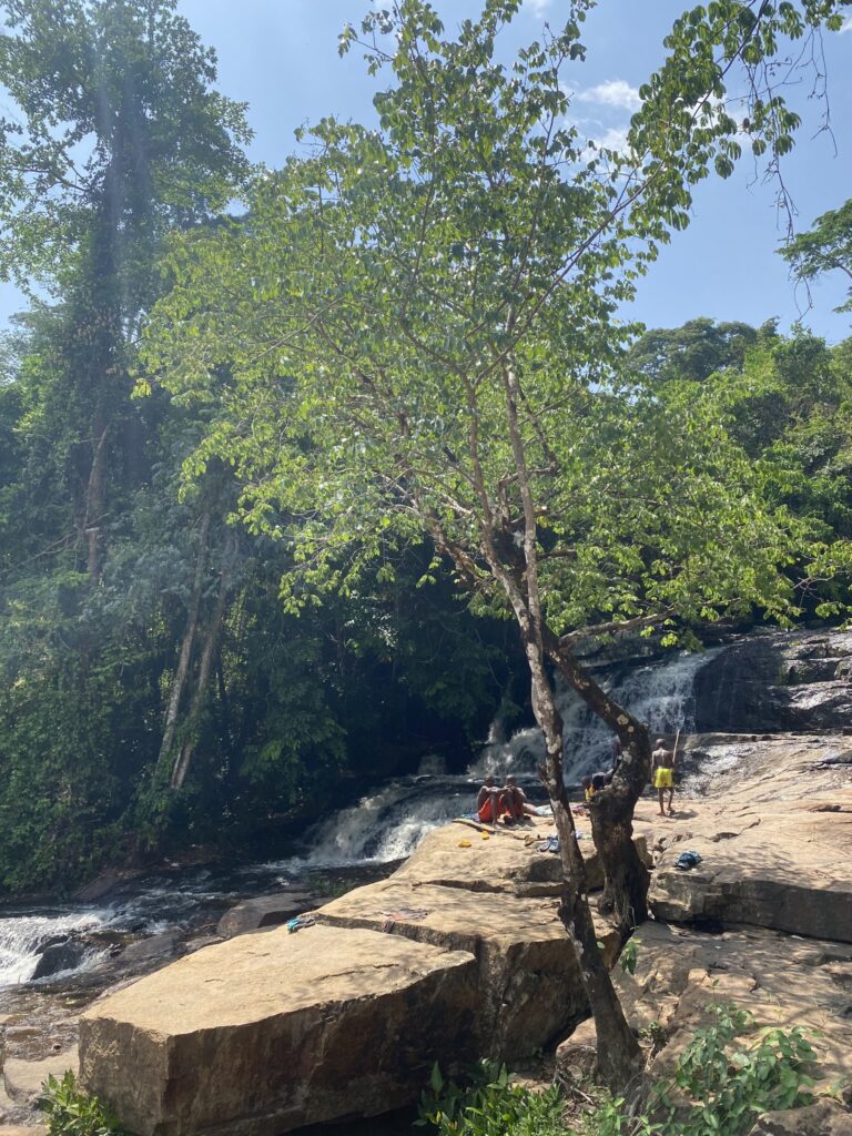 Man is a beautifully situated town, surrounded by many small hills. Luckily, the rain stopped the next day, so we set off to climb the most well-known peak, “La Dent de Man” (the Tooth of Man). We drove to a nearby village where the locals had organized themselves: they collected an entrance fee and provided a guide for the hike. The trail is actually available on public maps, but near the end there was a slightly more technical section, where it was helpful to have two young guys accompanying us. The 13-kilometer hike was beautiful, and the final hour to the top was very steep – we had to climb with both hands and even use a ladder at the end. The hike ended at a waterfall where many kids and adults were joyfully swimming and “jacuzzi-ing.” We could’ve used a refreshing dip ourselves, but we had miscalculated our food and water, so we were already quite thirsty and rushed back to the village.