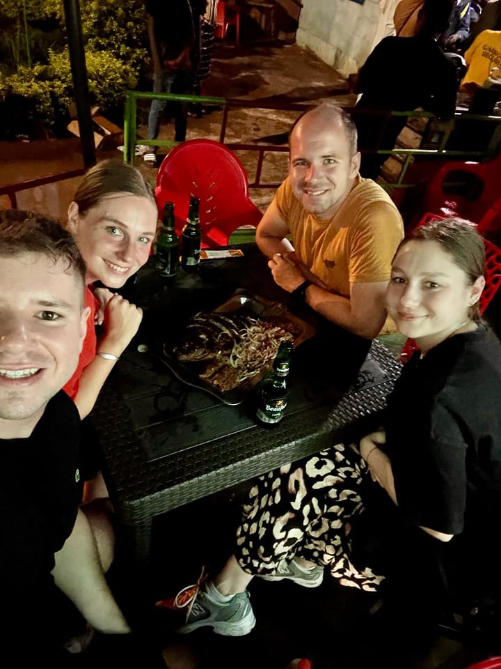 The rain also caught us off guard because Anna (Eszti’s sister) and Bálint (Eszti’s former classmate) were arriving that evening, and we had told them they wouldn’t need to worry about rain during their stay. Anna and Bálint had to travel across the entire country that day to get from Abidjan to Man. They landed in Abidjan the night before. The other “lie” we told them was that there are no serious power outages – we said that at night there’s always electricity, because even if it goes out, generators switch it back on. In contrast, their accommodation had no electricity all night – and without a fan or AC, the heat made it nearly unbearable. So they arrived in a rainy Man after two days of travel and no sleep – but fortunately, they were still in good spirits.